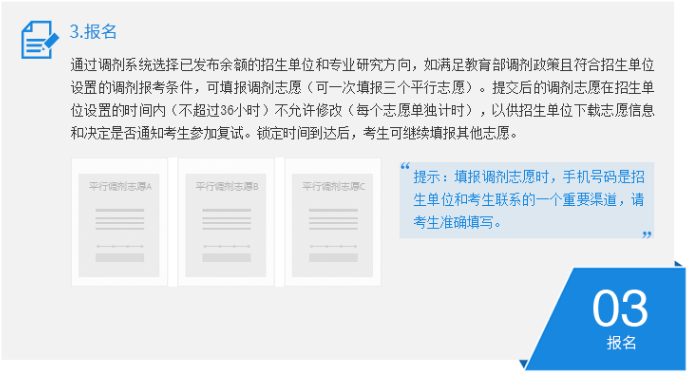 调剂服务系统开通24小时内,在满足条件的前提下可将调剂意向转为调剂服务系统中的调剂志愿。在调剂正式开始时,在调剂系统中可一次填报3个平行调剂志愿,每个调剂志愿提交后即由招生单位锁定,锁定时间由各招生单位自主设定,最长不超过36小时。